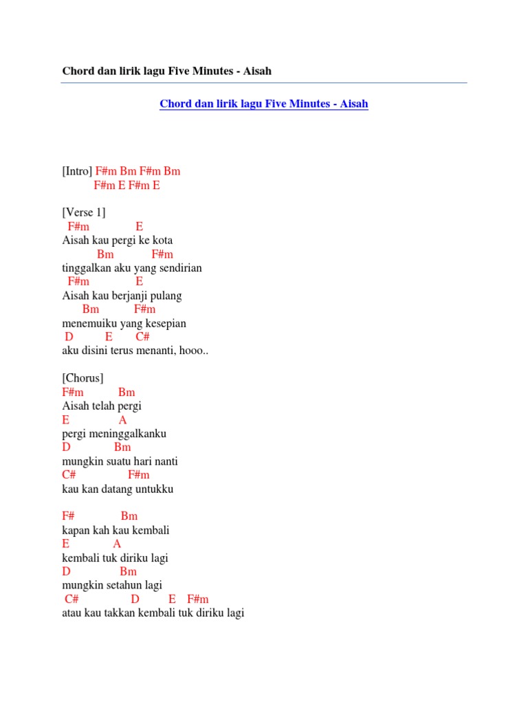 Chord Dan Lirik Lagu Five Minutes Aisah
