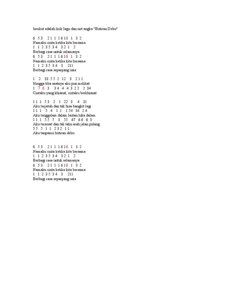 Aku tersesat dan tak tahu arah jalan pulang f g c aku tanpamu butiran debu. A e f#m aku tersesat dan tak tahu arah jalan pulang d e a aku tanpamu butiran debu. Tuliskan not angka dibawah ini kedalam not balok 5 6 7 4 2 1 5 ? Not angka bondan ya sudahlah.