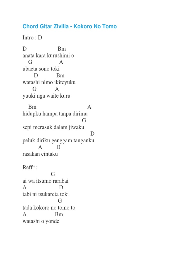 Chord Kunci Gitar Zivilia Kokoro No Tomo